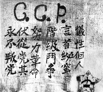 “犧性(牲)個人,言(嚴(yán))首(守)秘(注:秘錯)蜜(密),階級斗爭,努力革命,伏(服)從(注:從錯)黨其(紀(jì)),永不叛黨?!?